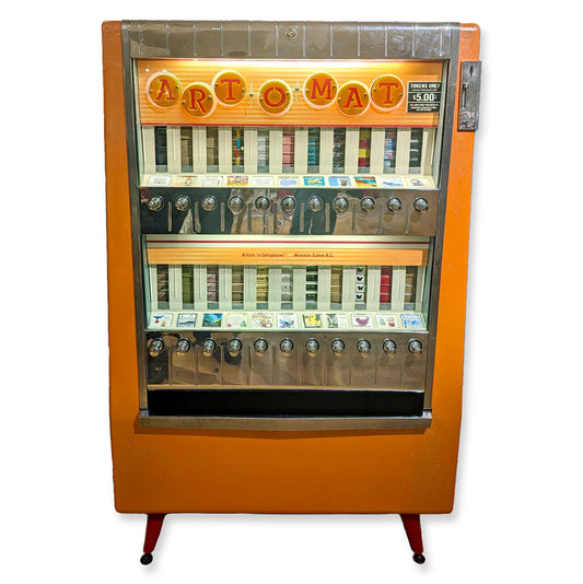 The Art-O-Mat was born in 1997 when artist Clark Whittington (Winston-Salem, NC) exhibited a selection of his paintings at a local café, the Penny Universitie. Alongside the paintings, Whittington dispensed his photographs from a then-recently banned cigarette vending machine. At the conclusion of the exhibit, café owner Cynthia Giles asked Whittington to make the machine a permanent installation. It was at this point that the two rounded up local artists to participate in what would soon become a National sensation.