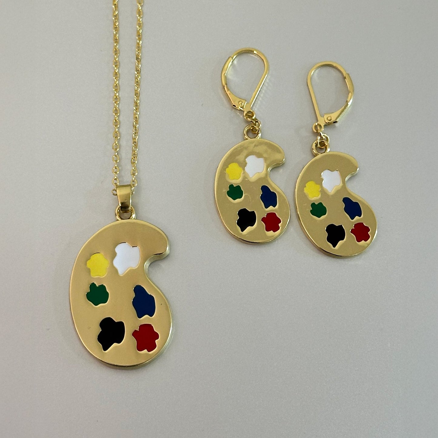 Elevate your style with our Artist's Palette Jewelry. Crafted from 18k gold, each piece features a unique artist's palette design with six vibrant enamel "paints". Choose from lever-back earrings or a sophisticated 18 inch necklace. Add a touch of creative flair to any outfit.