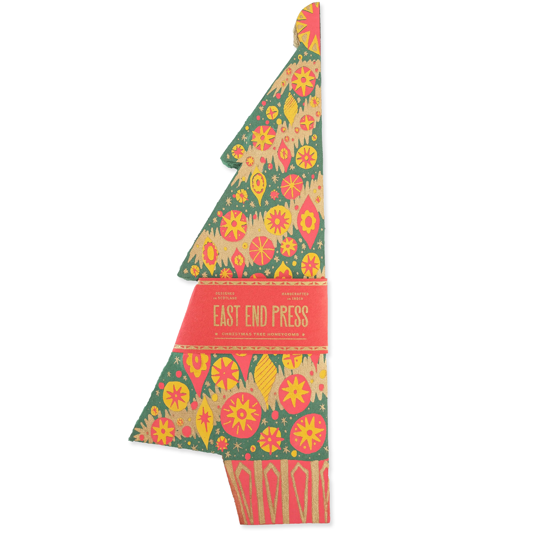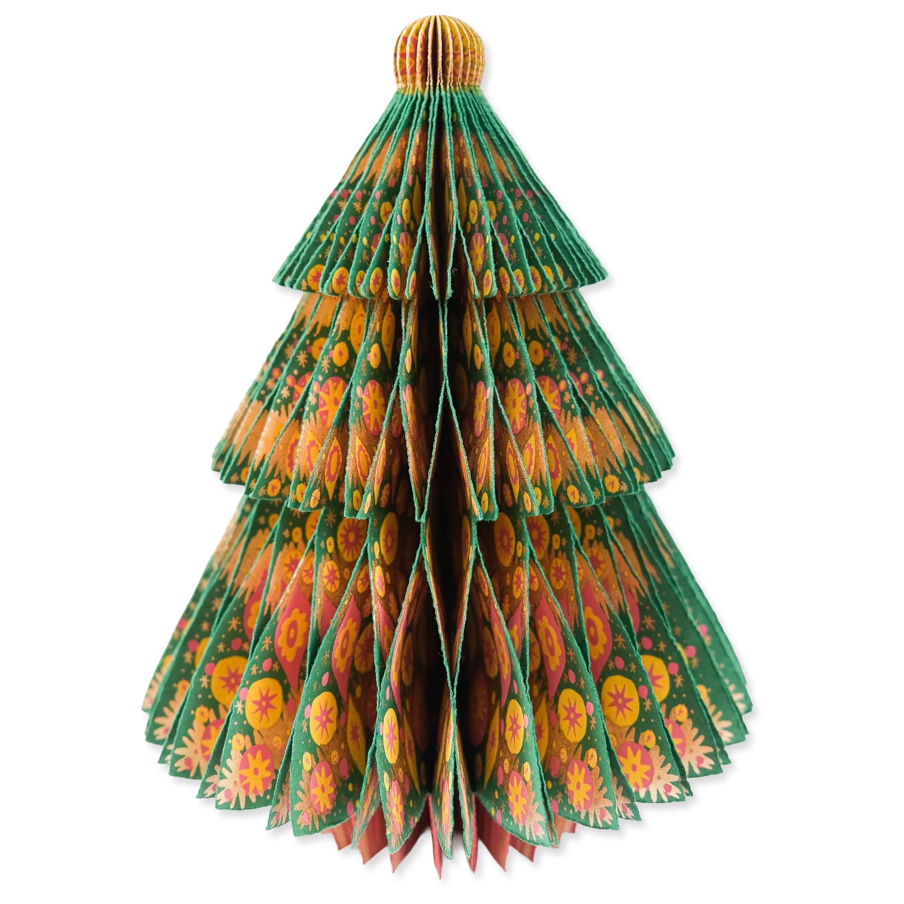 Discover the artistry of sustainable holiday décor with this exquisite honeycomb Christmas tree ornament. Handcrafted by skilled artisans in Jaipur, each piece features intricate layers of recycled cotton paper that unfold to reveal a stunning three-dimensional honeycomb structure. The magnetic closure keeps the ornament securely expanded for display, while its elegant tree silhouette adds sophisticated charm to any space. Measuring 14.1 × 5.5 inches (36 × 14 cm) when flat and expanding to 14.1 × 11 inches (36 × 28 cm), this environmentally conscious decoration combines traditional screen-printing techniques with modern sustainability practices, making it a thoughtful choice for the conscientious collector.