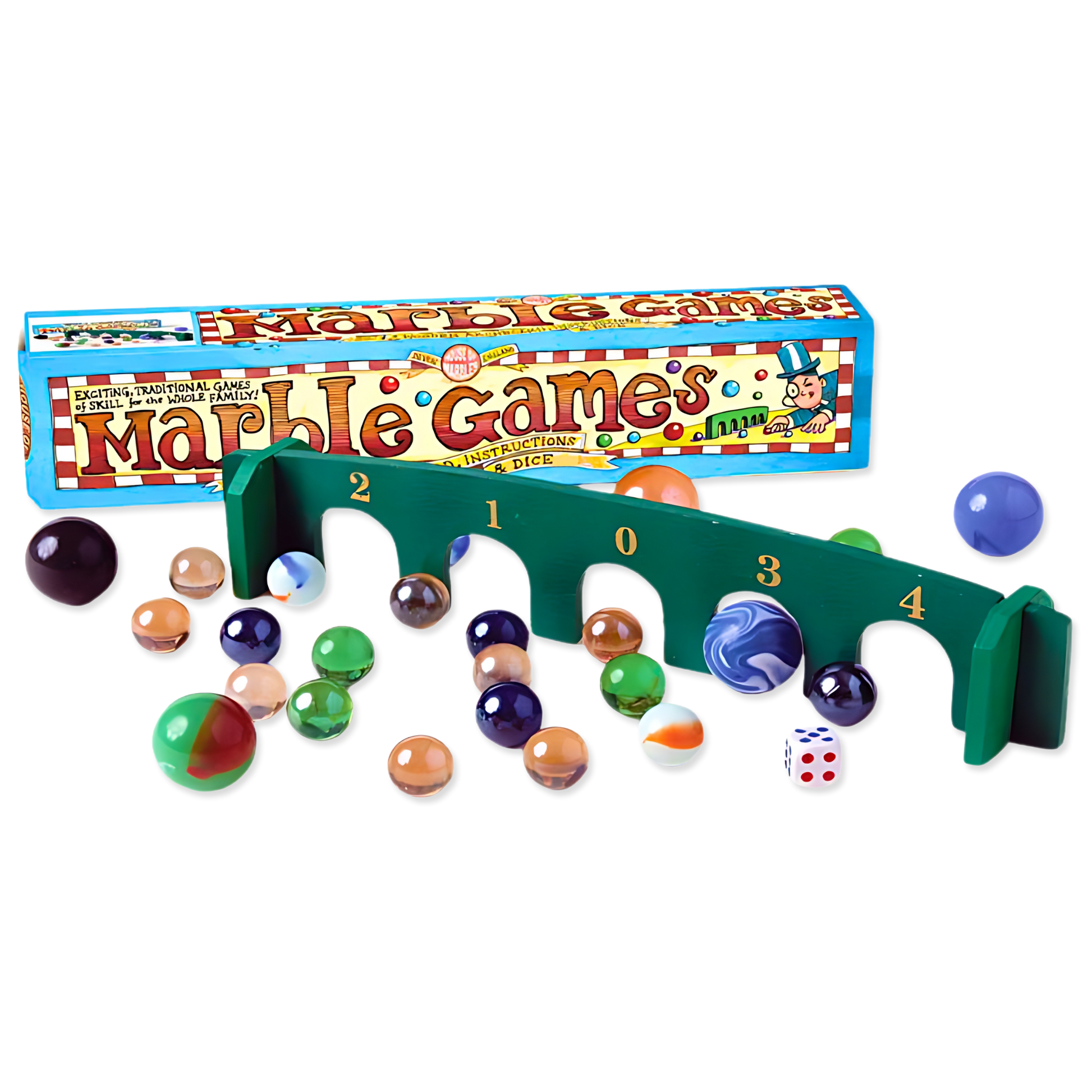Diese Reihe von Murmelspielen ist ein Spaß für die ganze Familie. Enthält eine Auswahl an Glasmurmeln in verschiedenen Größen und Farben, ein hölzernes Miniatur-Bogenbrett, ein Paar Würfel und Anleitungen für viele Spiele.