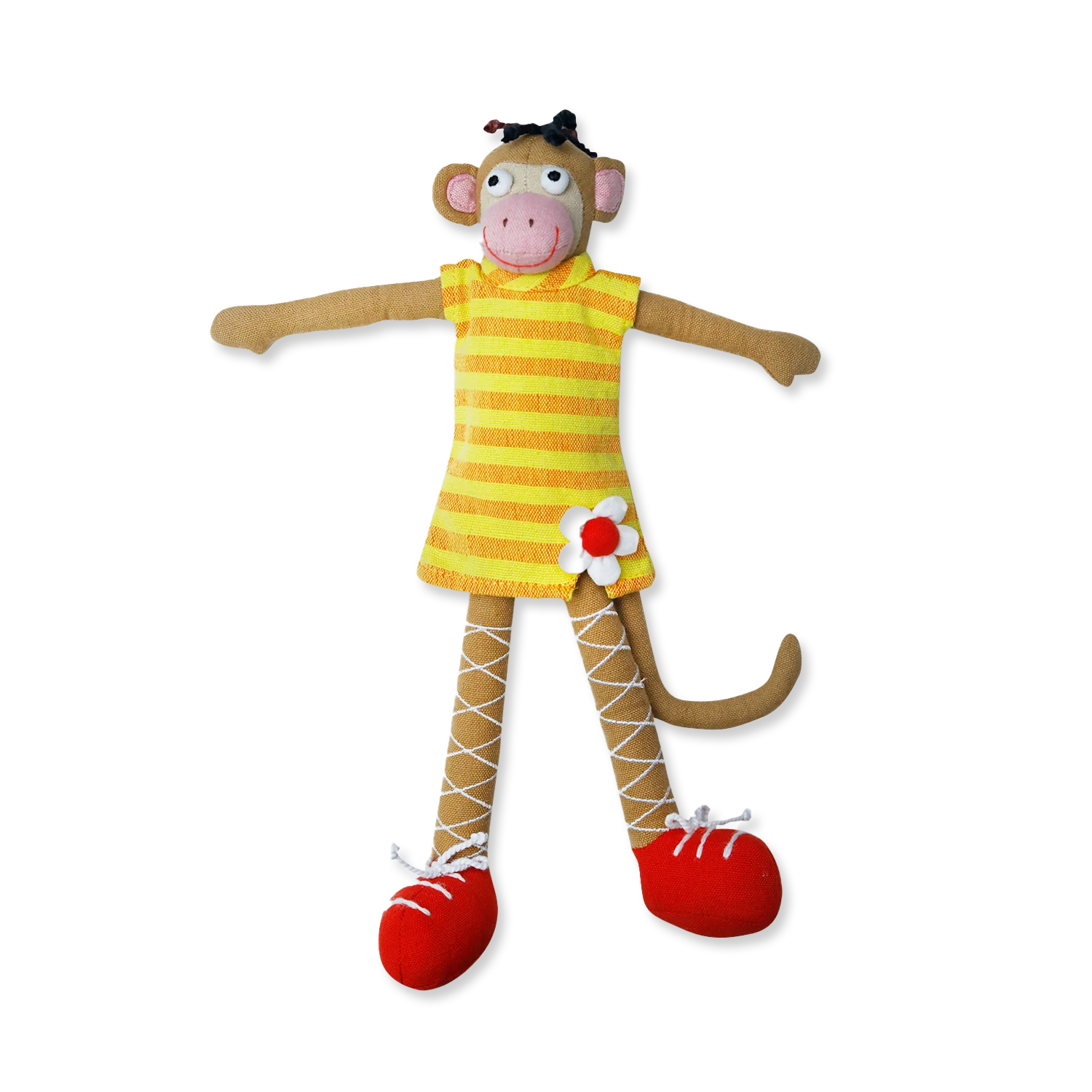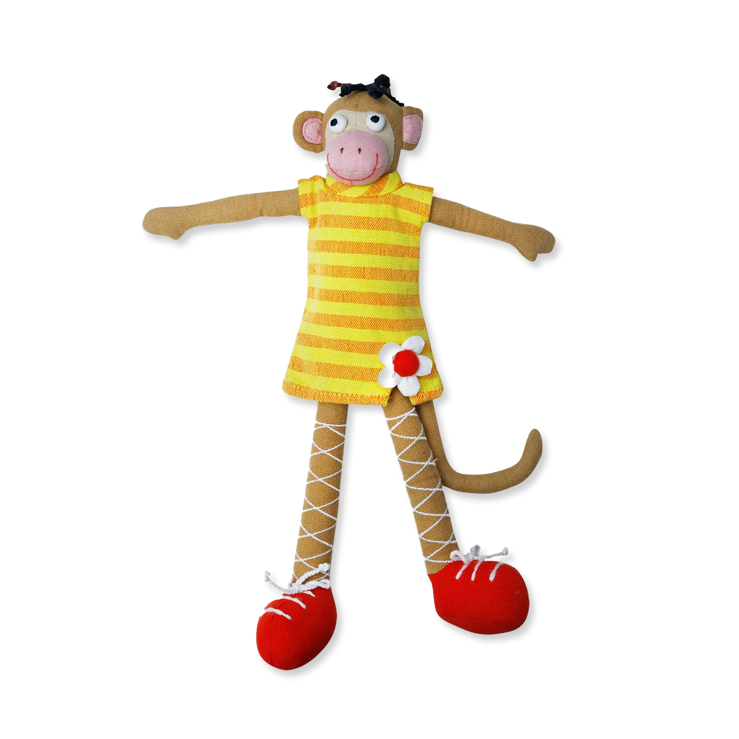 Meet Maya, the lovable monkey doll from Sri Lanka. Made with 100% cotton and a soft poly fiber fill, she's as cuddly as can be. Her cute yellow striped dress and red shoes make her the perfect accessory for playtime or nap time. Get ready for endless fun with Maya!