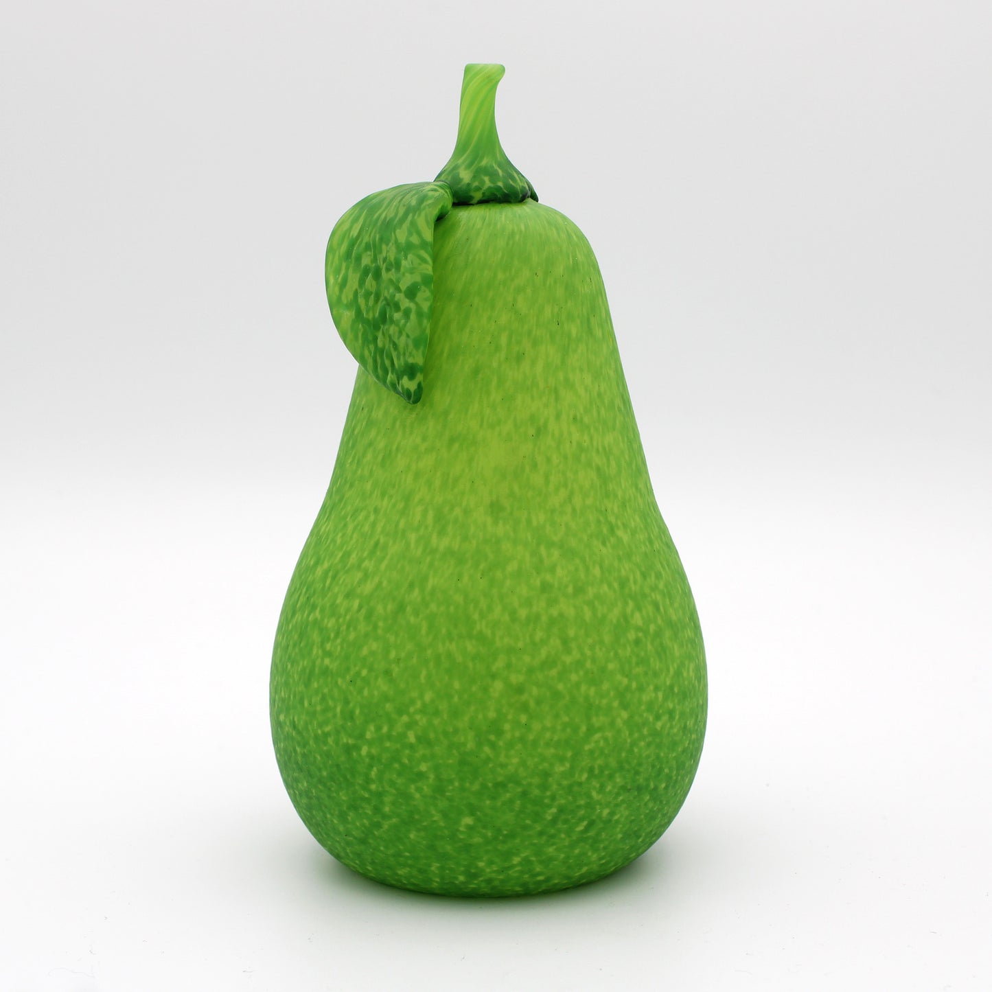 Add a touch of whimsy to your desk with this handmade glass fruit paperweight! The bright green pear stands upright with a curved stem and leaf, creating a fun and playful design. Made by Grateful Gathers Glass, it features a smooth matte texture and hollow inside for a lightweight feel.