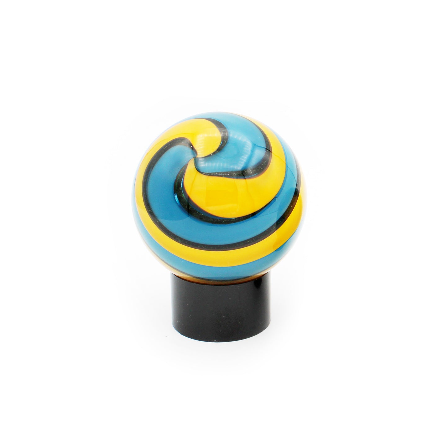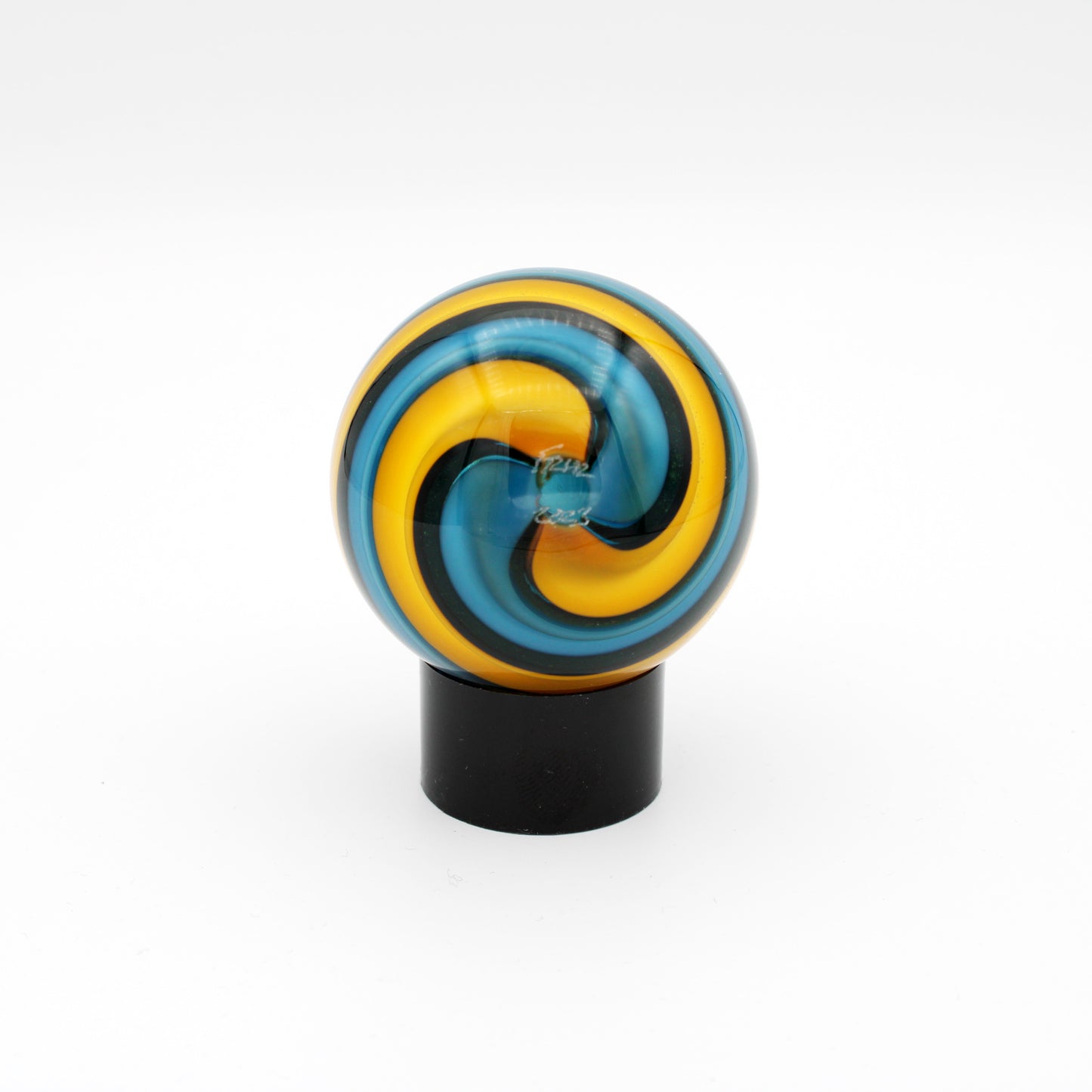 Türkisblau und helles Gelb, mit glitzerndem dunkelgrünem Aventurin-Strudel. Ungefähr 2 Zoll im Durchmesser.