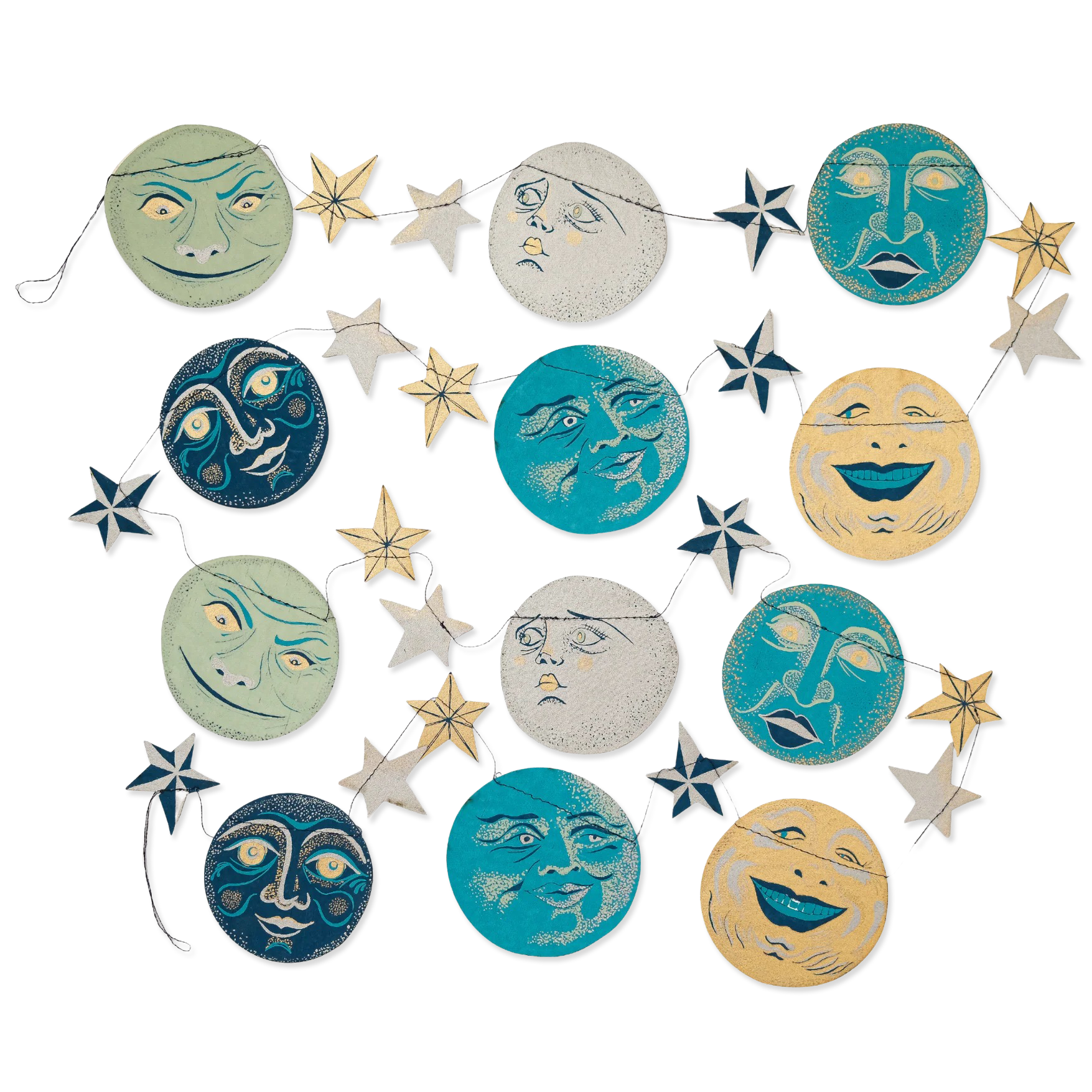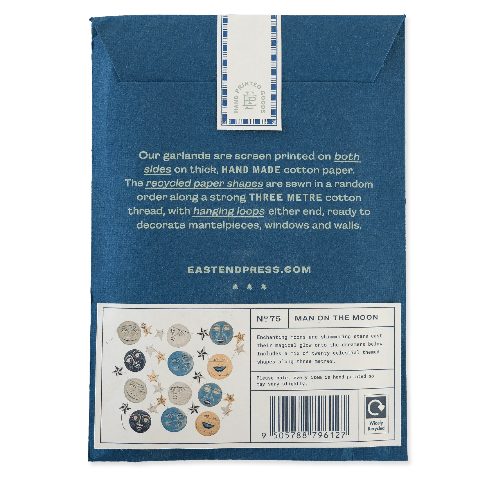 This Man in the Moon Garland features a captivating array of thirty celestial shapes stretched along three meters (12 large moons, and 18 stars). Hand-screen printed on both sides by skilled artisans in Jaipur, each piece showcases meticulous craftsmanship. Crafted sustainably from recycled materials, this garland brings ethereal charm and eco-conscious quality to any space, perfect for adding a delicate, starry ambiance to your décor.