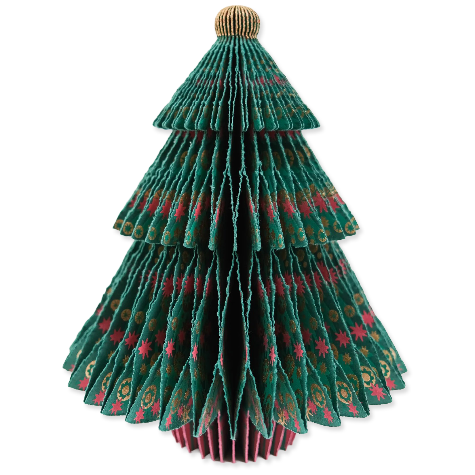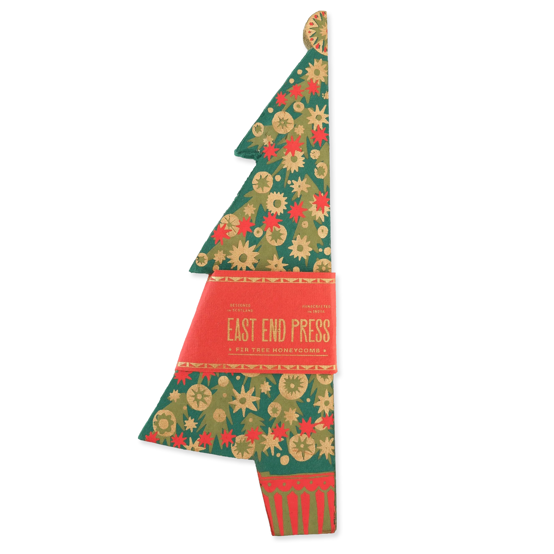 Transform your holiday display with this beautifully engineered honeycomb fir tree ornament. Meticulously constructed from layered recycled cotton paper, this piece unfolds to unveil an intricate three-dimensional honeycomb design that captures light and shadow with remarkable depth. Hand-screened by master craftspeople in Jaipur, each ornament showcases the precision of traditional artisanal techniques applied to sustainable materials. Magnetic closures ensure the ornament remains securely expanded during display. Compact yet impactful at 11 × 4.3 inches (28 × 11 cm) when folded and 11 × 8.6 inches (28 × 22 cm) when fully opened, this eco-conscious decoration represents a refined approach to seasonal embellishment for the discerning collector.