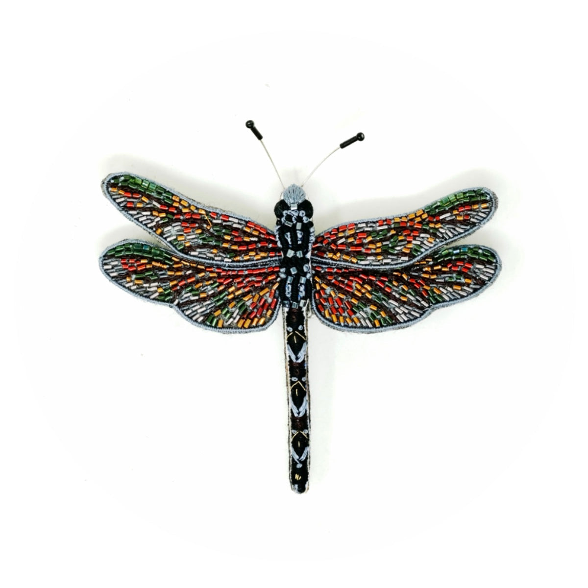 The Wandering Glider dragonfly is a master of the skies, known for its long migrations and delicate, iridescent wings. This brooch captures its graceful form and shimmering patterns with intricate embroidery and carefully placed beadwork, evoking the elegance of this remarkable insect in flight. Handmade by skilled artisans in India, each piece transforms traditional craftsmanship into a wearable tribute to one of nature’s most agile and captivating flyers.