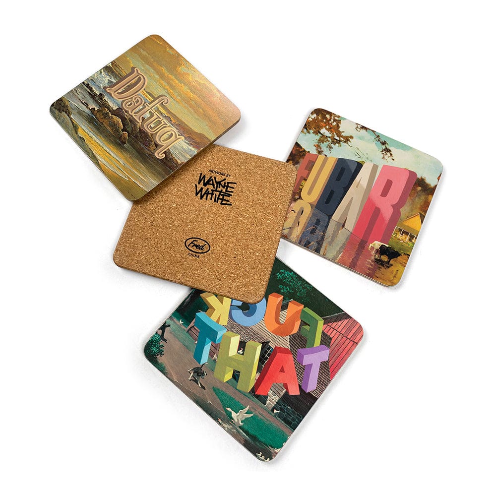Protect your tabletops from water rings with Wayne White's Cø@$†ers! Featuring original artwork including profanities like "F*ck That" and "Dafuq", this set of 4 durable MDF coasters with cork backing adds a playful touch to any coffee table. Pour yourself another and let the good times roll!