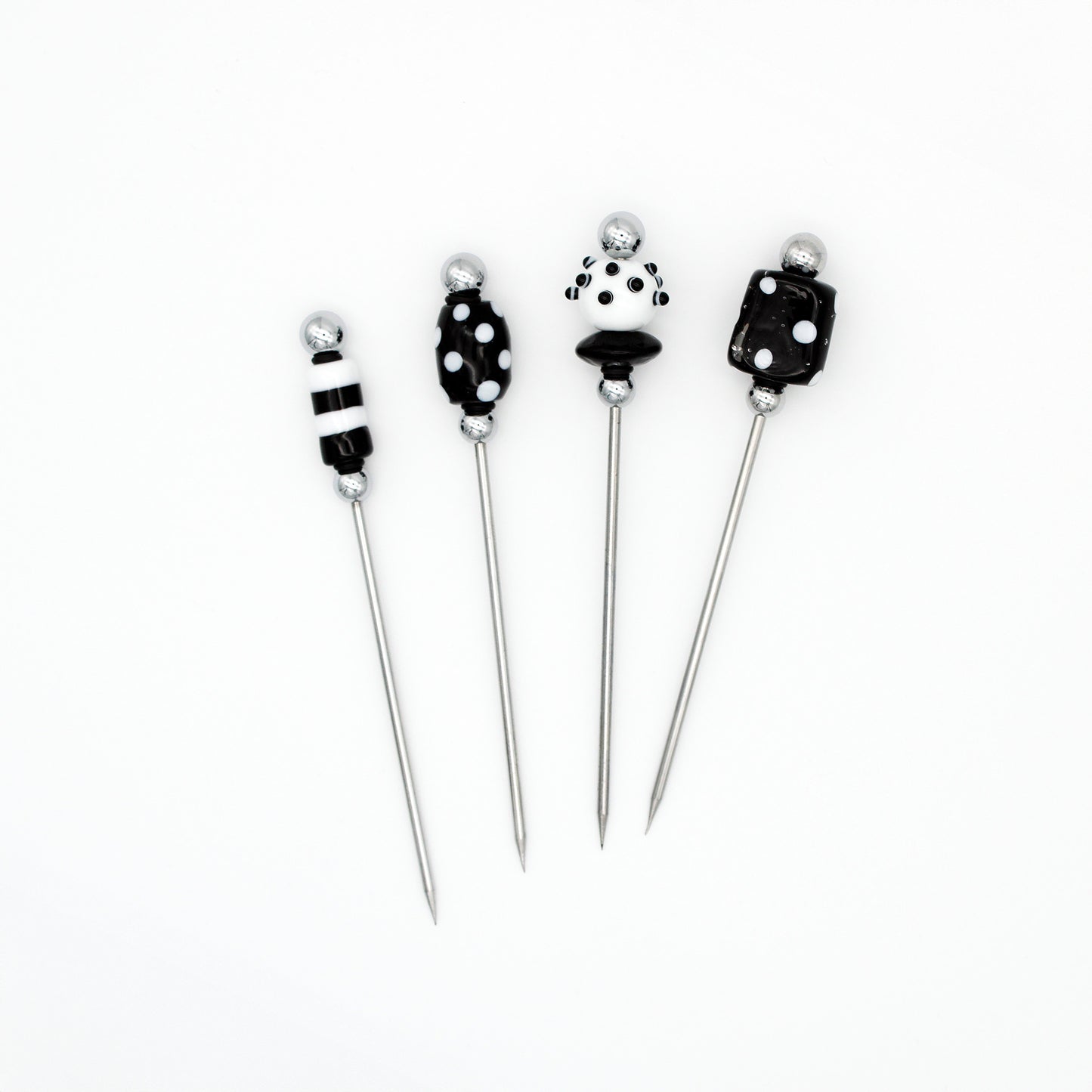 Add a playful touch to your hors d'oeuvres with our set of four Canape Picks. Each pick features a unique handmade glass bead, available in either sophisticated black and white or vibrant multicolored options. Made with durable stainless steel, these picks are the perfect way to serve up your favorite small bites.