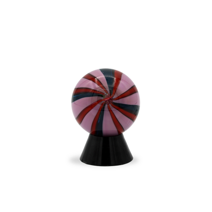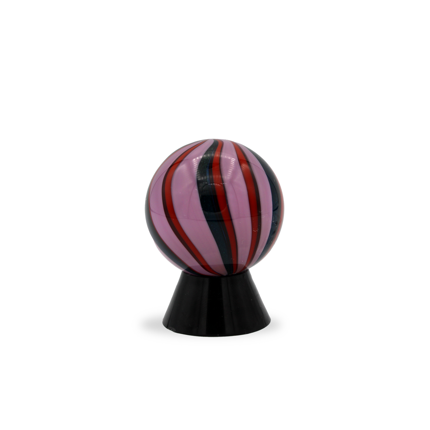 Add a pop of color to your collection with our handmade marble. Straight stripes in pink, red, and sparkly aventurine green make for a playful and eye-catching design. Perfect for displaying and playing, this 1½ inch marble is a must-have for any collector. Glass marbles made by Fritz Lauenstein are sought after by collectors for their fine craftsmanship and unique designs. Signed and dated by the artist.