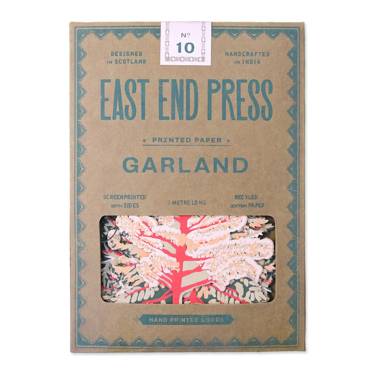 This beautifully handcrafted paper garland showcases ten fir trees—two each of five distinct varieties—silkscreened by hand on both sides. Designed in Scotland and meticulously made in Jaipur, India, it offers an authentic artisanal touch perfect for sophisticated holiday decorating. The double-sided silkscreening ensures vibrant detail from every angle, enhancing seasonal displays with elegance and craftsmanship.