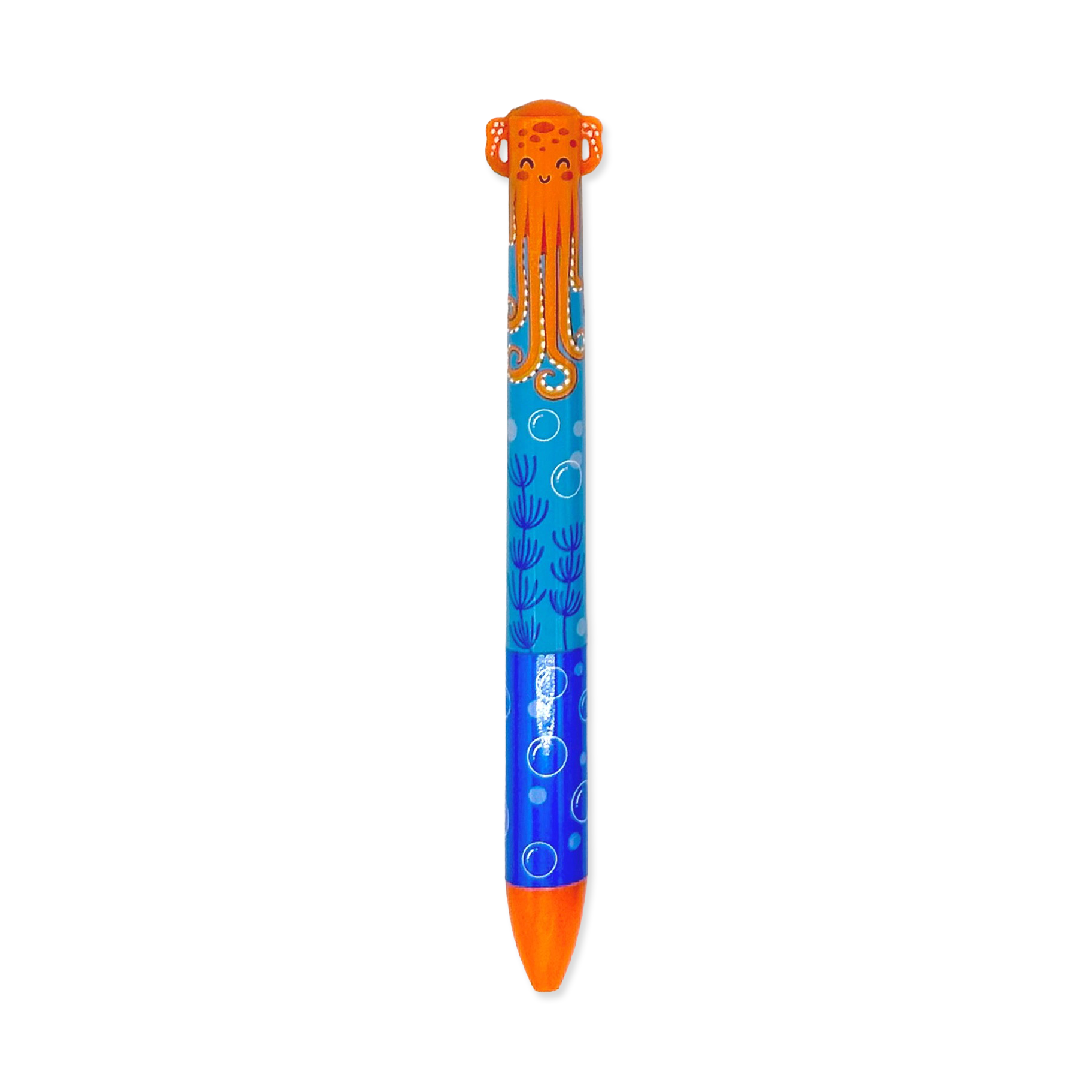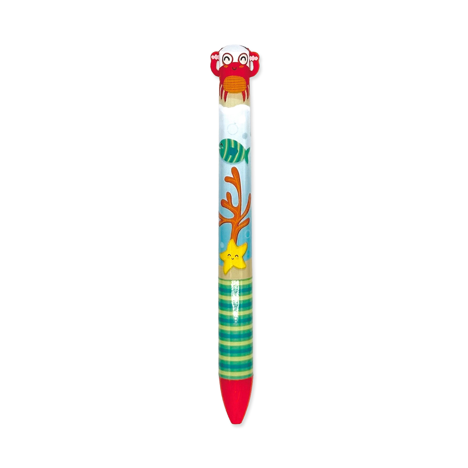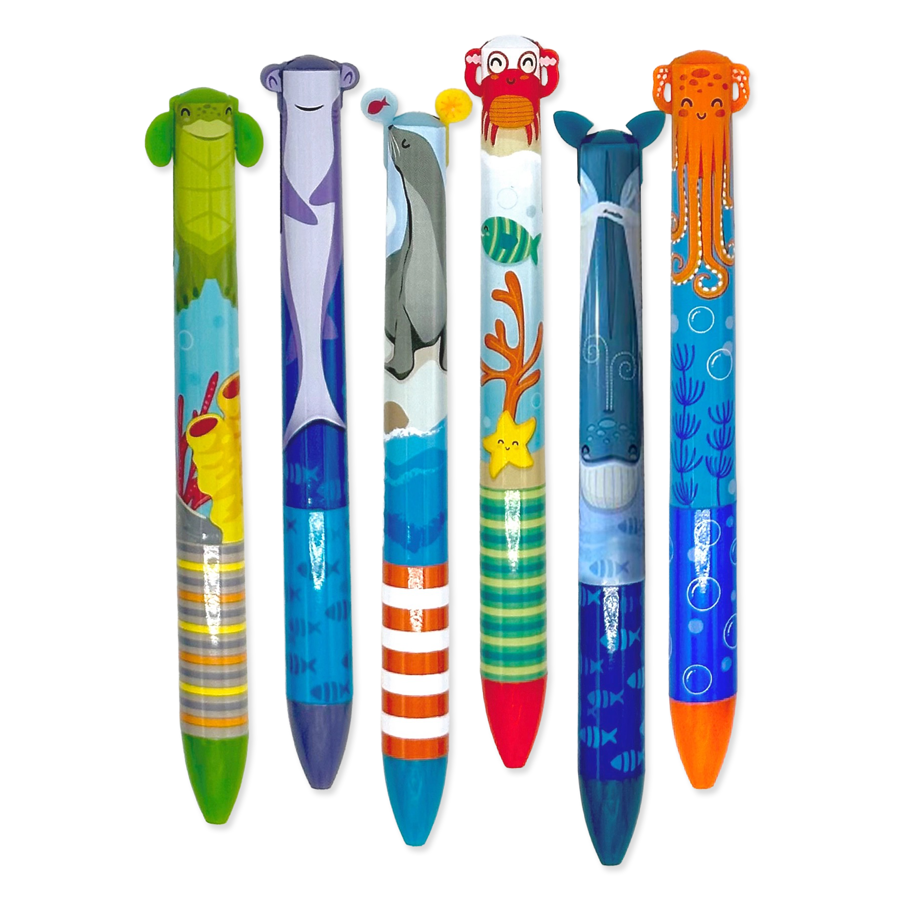 Dive into creativity with Twice-As-Nice 2-Color Click Pens featuring fun sea life designs! Each pen lets you switch between two vibrant inks just by clicking the arms or tails—whether it's the Turtle's calming blue and green, the Shark's adventurous blue and purple, the seal's light and dark blue, the crab's blue and red, the whale's blue and black, or the playful Octopus's blue and orange. Perfect for adding a splash of color to notes or doodles, these pens make writing a delightful underwater adventure.