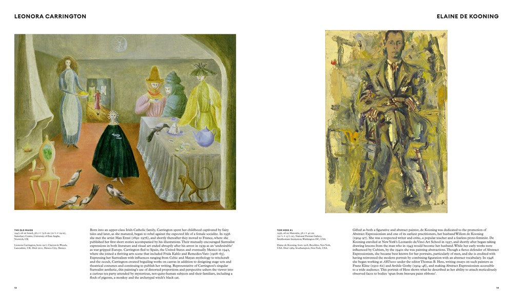 Artists featured include: Hilma af Klint, Eileen Agar, Sofonisba Anguissola, Cecily Brown, Leonora Carrington, Mary Cassatt, Elaine de Kooning, Marlene Dumas, Nicole Eisenman, Jadé Fadojutimi, Helen Frankenthaler, Artemisia Gentileschi, Maggi Hambling, Carmen Herrera, Gwen John, Frida Kahlo, Tamara de Lempicka, Agnes Martin, Joan Mitchell, Alice Neel, Plautilla Nelli, Georgia O'Keeffe, Paula Rego, Bridget Riley, Jenny Saville, Dana Schutz, Lee Krasner, and Yayoi Kusama.