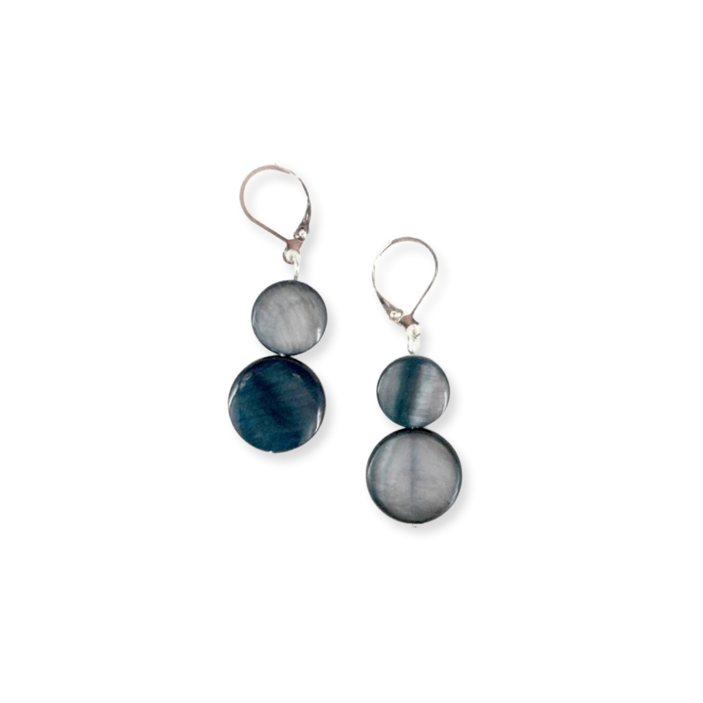 Lustrous black mother-of-pearl discs, carefully treated and finished to enhance their natural iridescence, create an understated yet sophisticated accessory. Each coin showcases the depth and subtle play of light characteristic of premium nacre, making these earrings equally at home with evening wear or refined everyday styling.