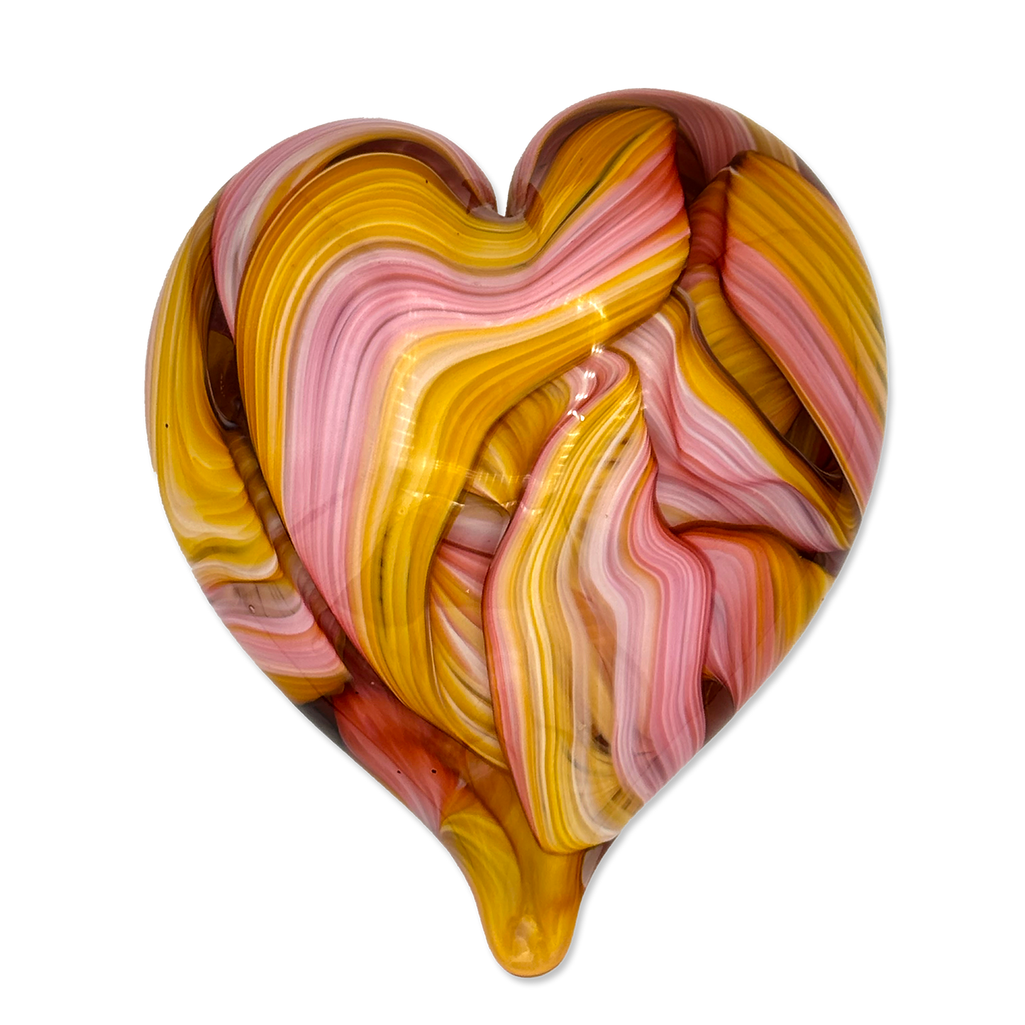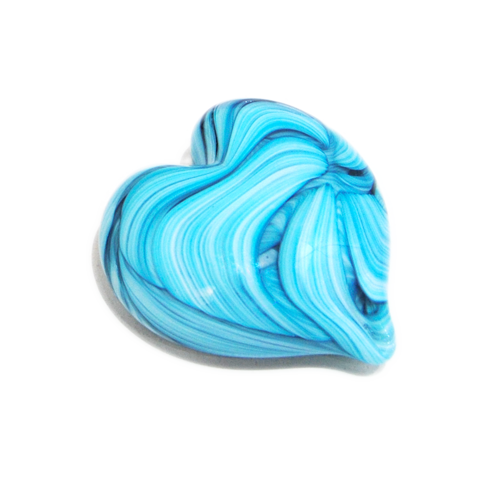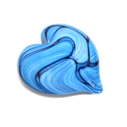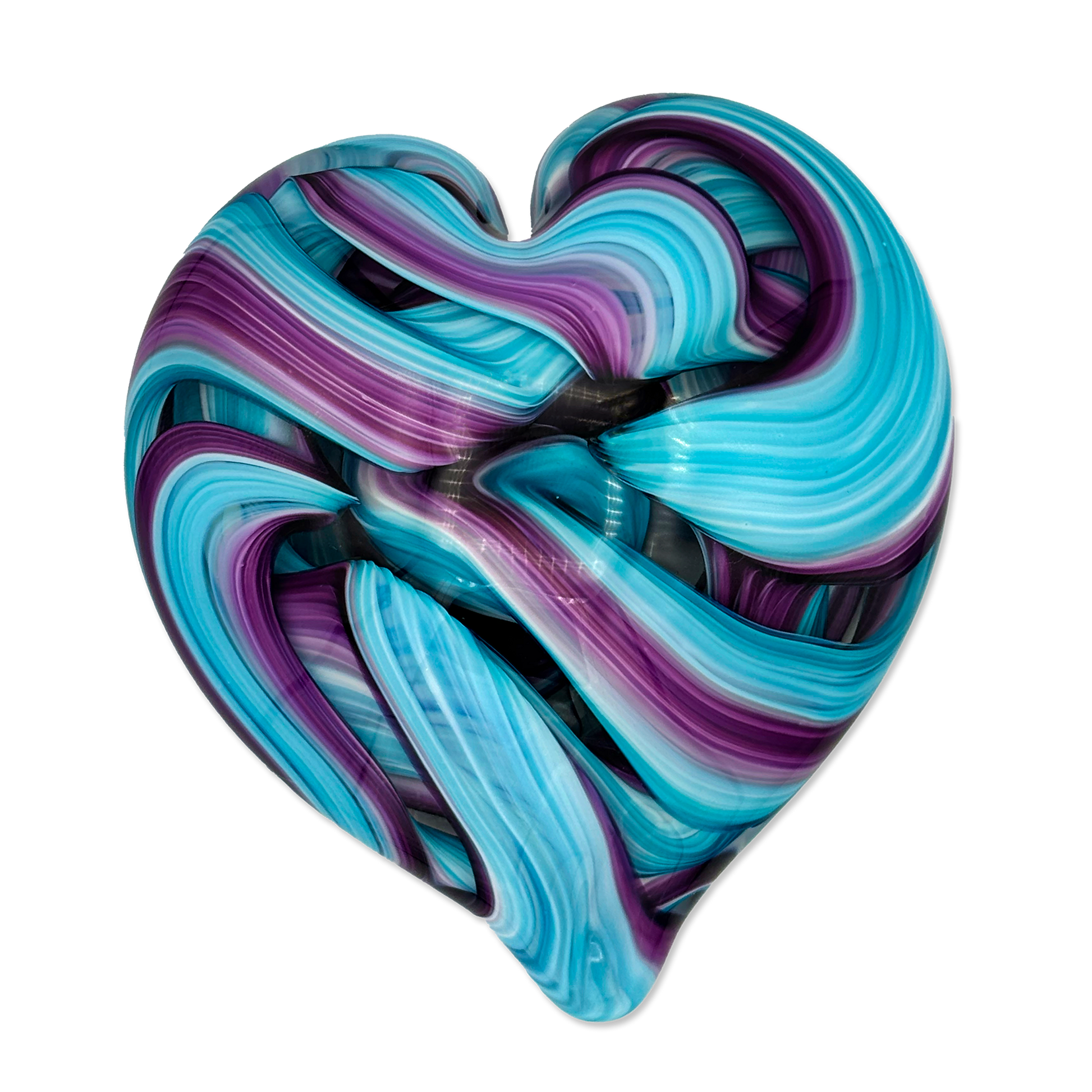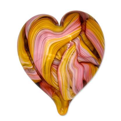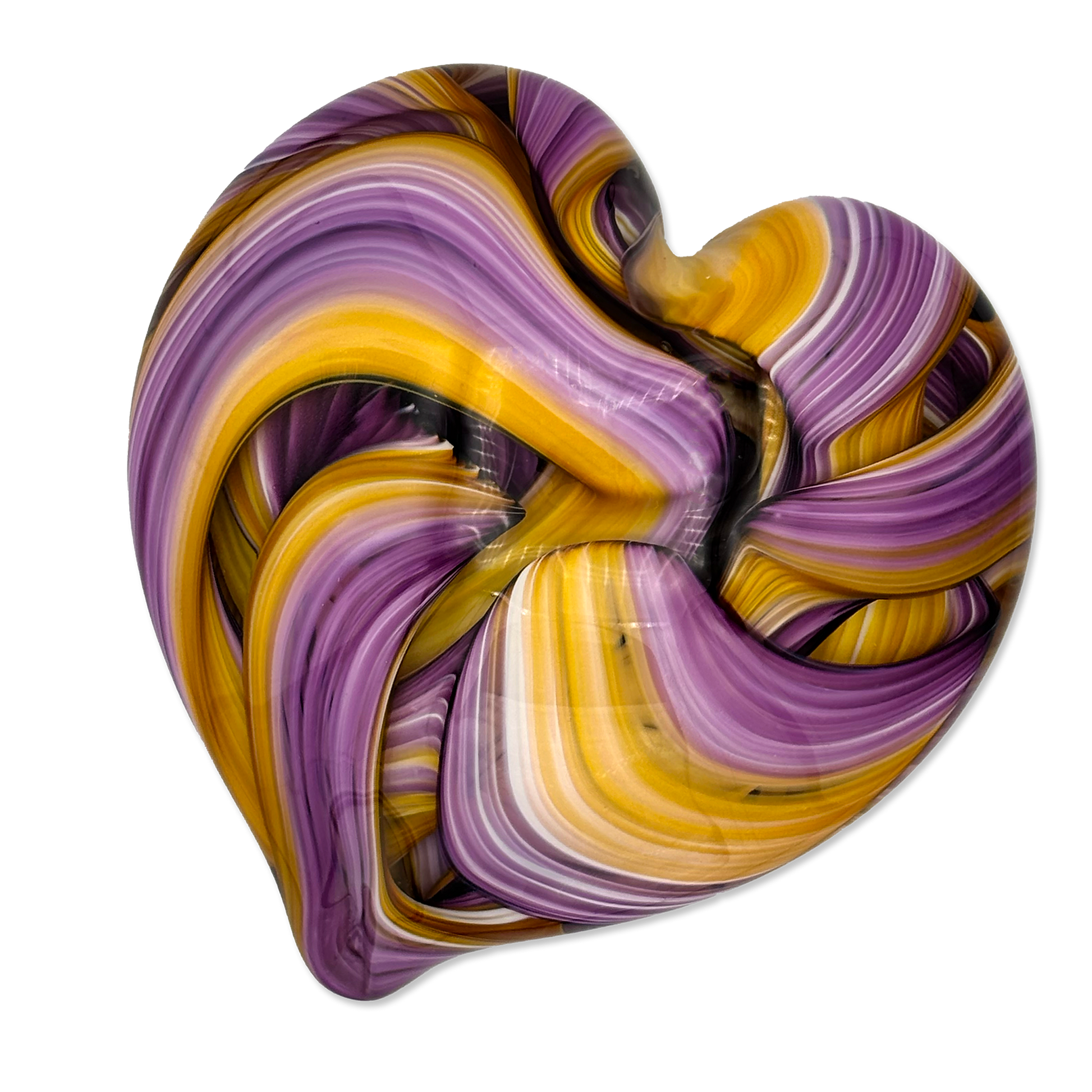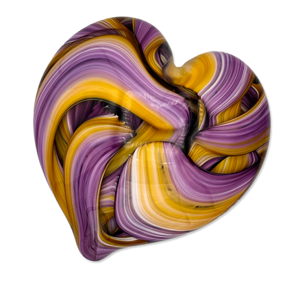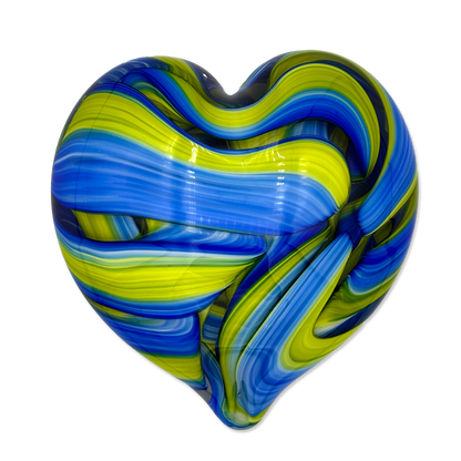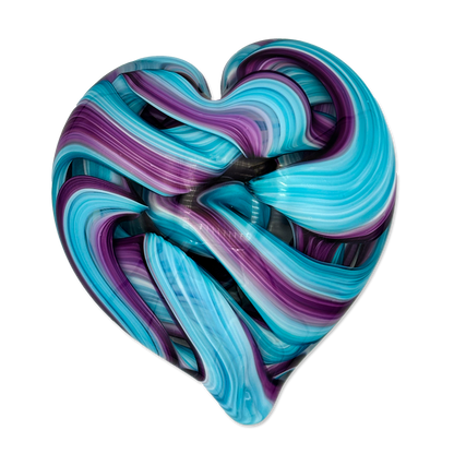 Handcrafted by expert glass artist Jake Pfeffer of Hot Glass Alley, this solid glass ribbon heart paperweight is a beautiful fusion of art and functionality. Made with precision and care, it adds a touch of elegance to any desk or home office.