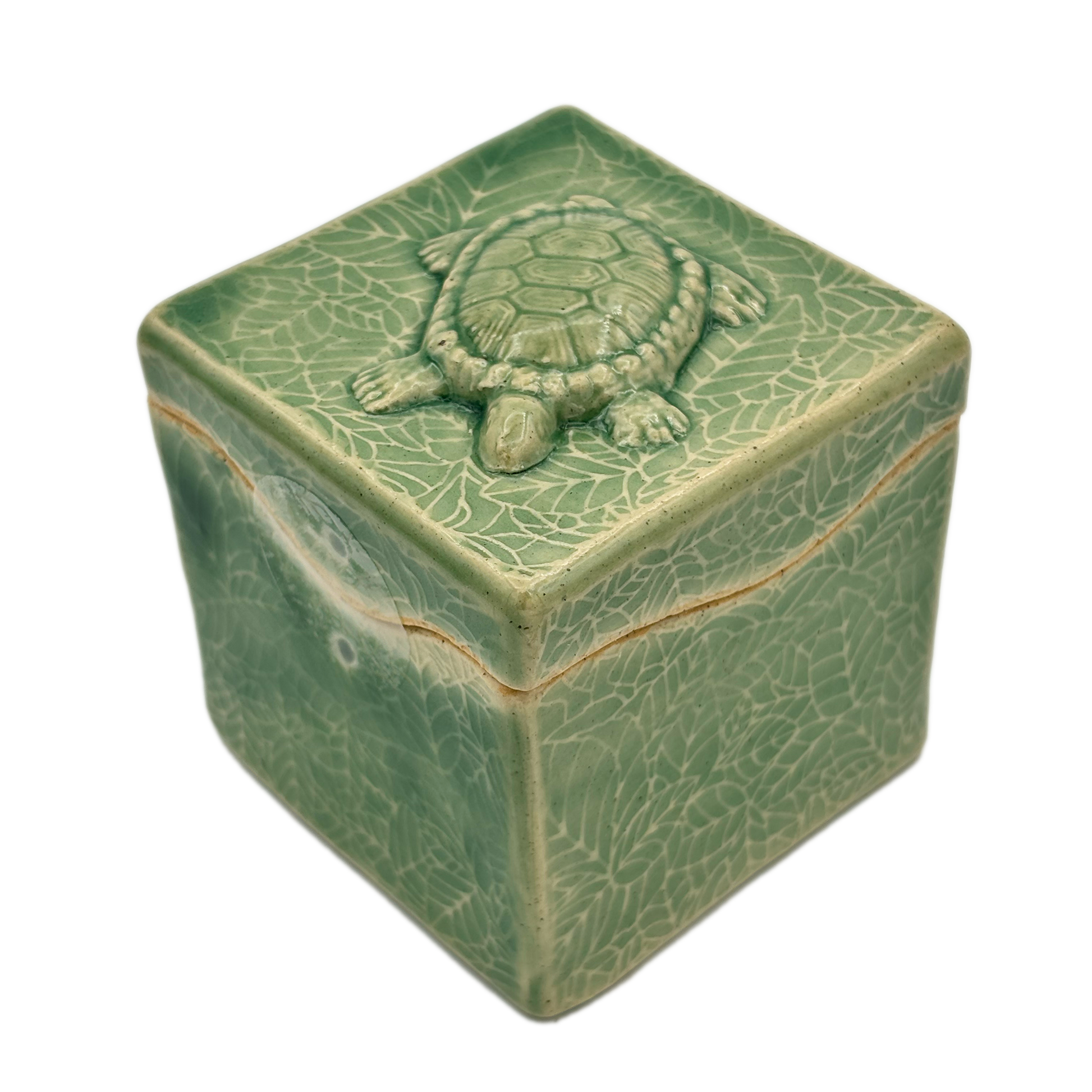 This Handmade Ceramic Critter Box features an elegant leaf texture on the sides and bottom, with a charming Snapping Turtle on the lid. Made from white stoneware and finished with a beautiful Wasabi Celadon glaze.