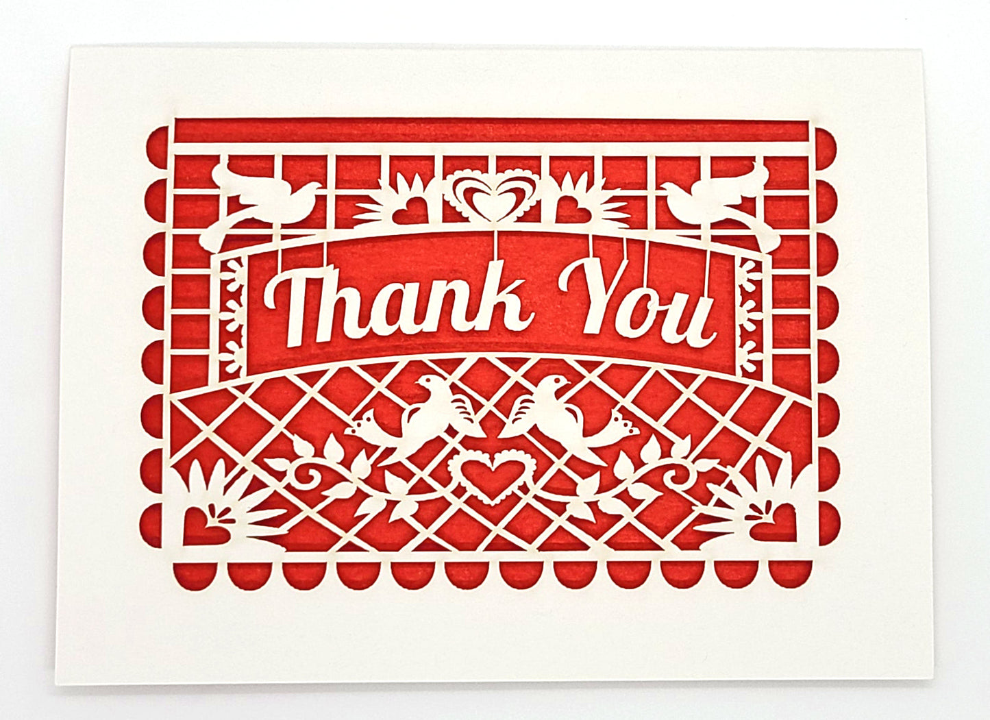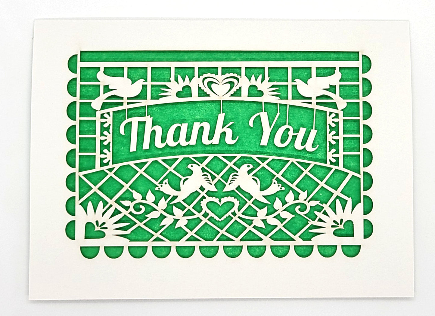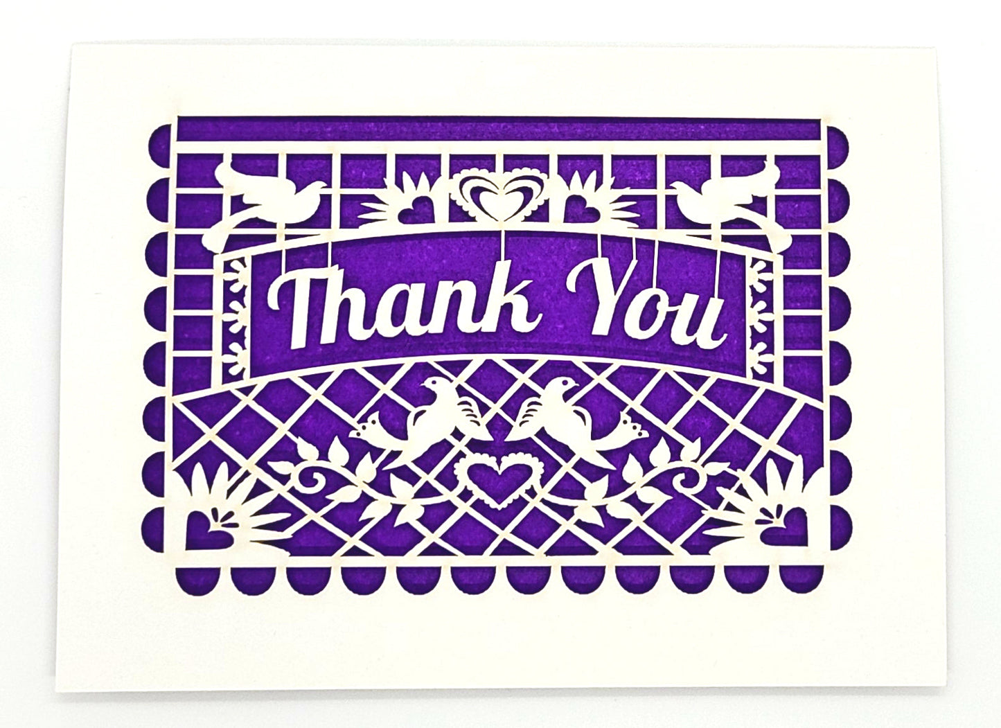 Delicate laser-cut greeting card featuring a traditional "papel picado" (perforated paper) design that says, "Thank You". Backed by a colorful tissue paper insert. You will receive one of the colors shown at random.