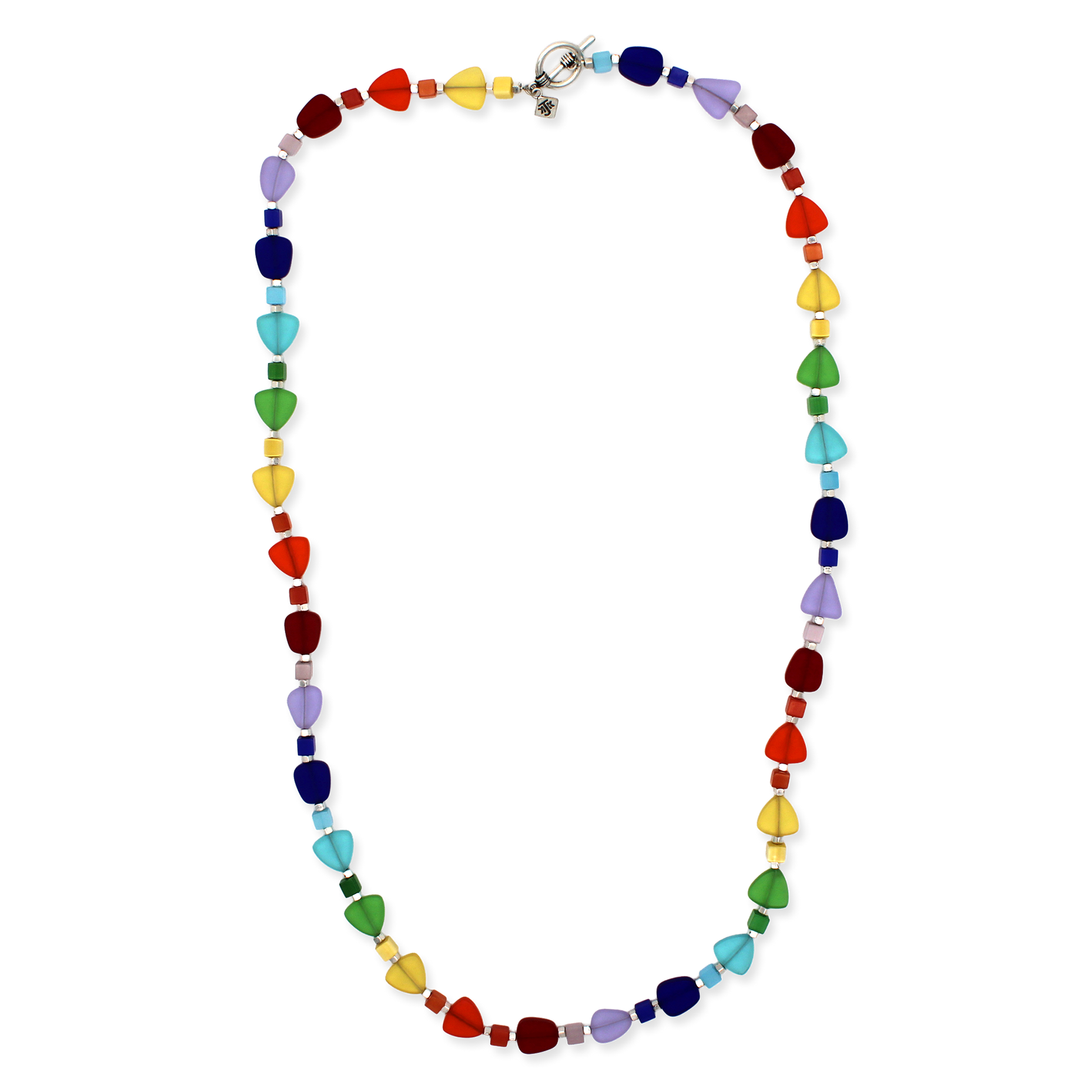 Add a splash of color to any outfit with our Rainbow Frosted Glass Necklace! This playful long necklace features a dazzling array of rainbow-hued recycled glass beads that catch the light with their frosted finish. Twinkling fiber optic beads create magical light effects as you move, while silver-plated cube spacer beads add geometric flair. The silver-plated toggle clasp makes it easy to secure this cheerful accessory that's as fun as it is eco-friendly!