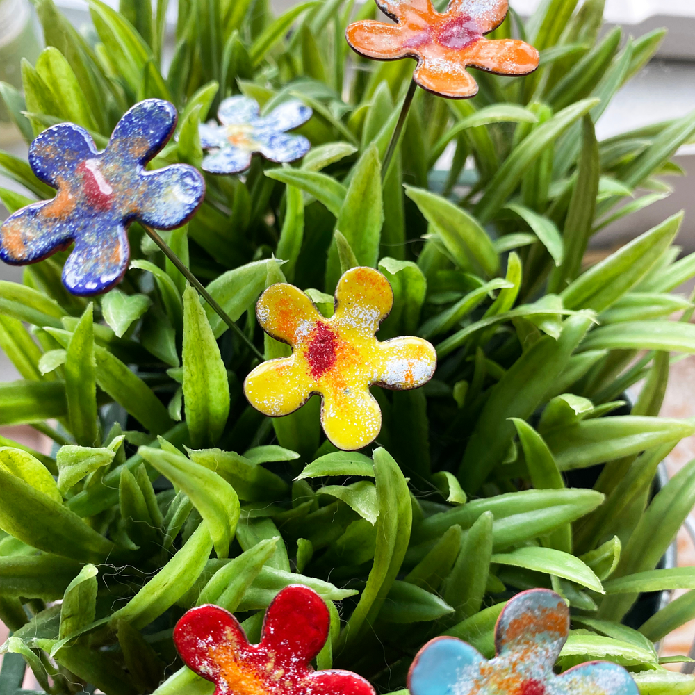 Add some colorful charm to your plants or garden with our Small Enameled Copper Flower! This bendable wire flower comes in assorted colors to brighten up any space. Indoor or outdoor, it's a quirky addition for any plant lover.